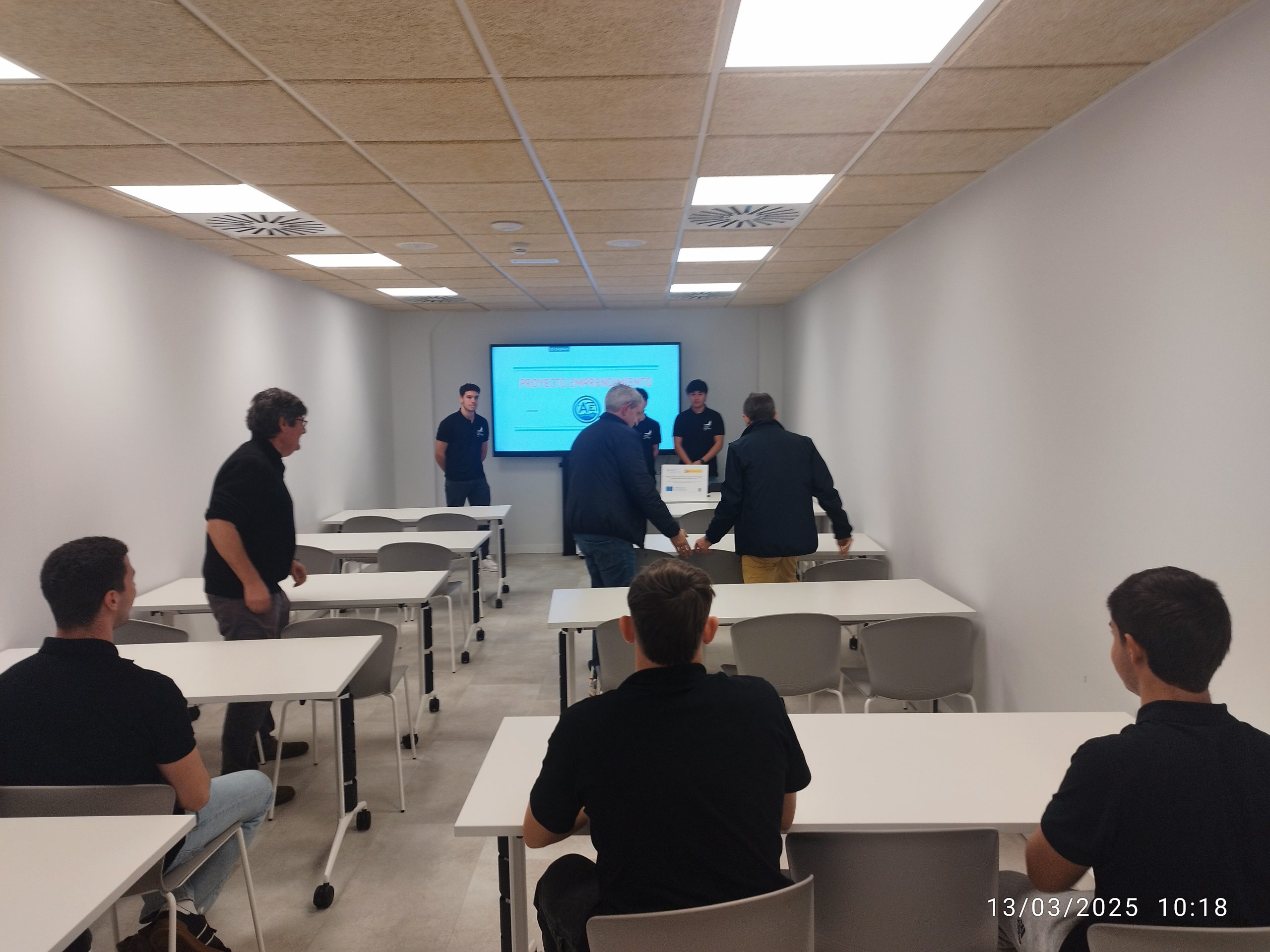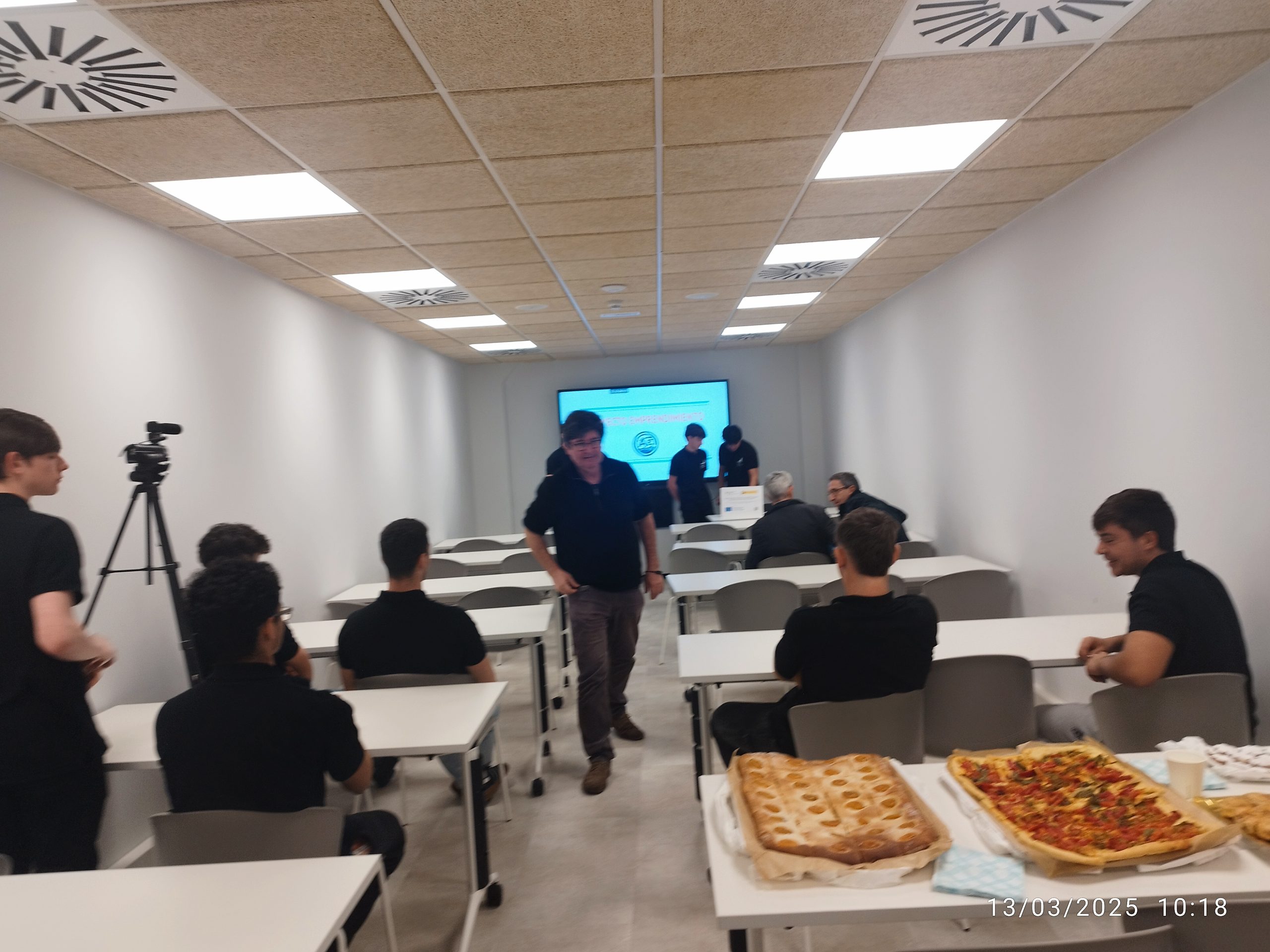 L’alumnat va preparar una presentació audiovisual projectada en pantalla i un discurs estructurat, havent-se entrenat prèviament a classe amb la càmera de vídeo del centre per reforçar l’expressió oral i la capacitat de resposta davant les preguntes del públic.